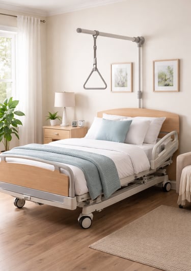 Visual checks and minor adjustments to hospital beds, bed rails, and surrounding layout to support safe transfers, comfort, and nighttime stability.